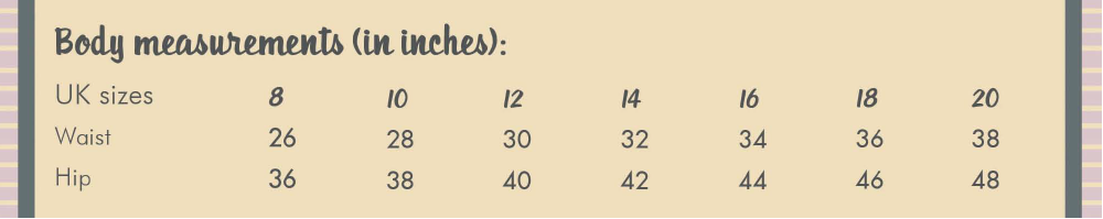 At first glance, I look to be about a size 14.  Fine, this isn’t unexpected, I usually buy either a 12 or 14 depending on the store (UK sizes BTW).  But then I read on and discovered that the waist measurement isn’t your natural waist but 2″ below.