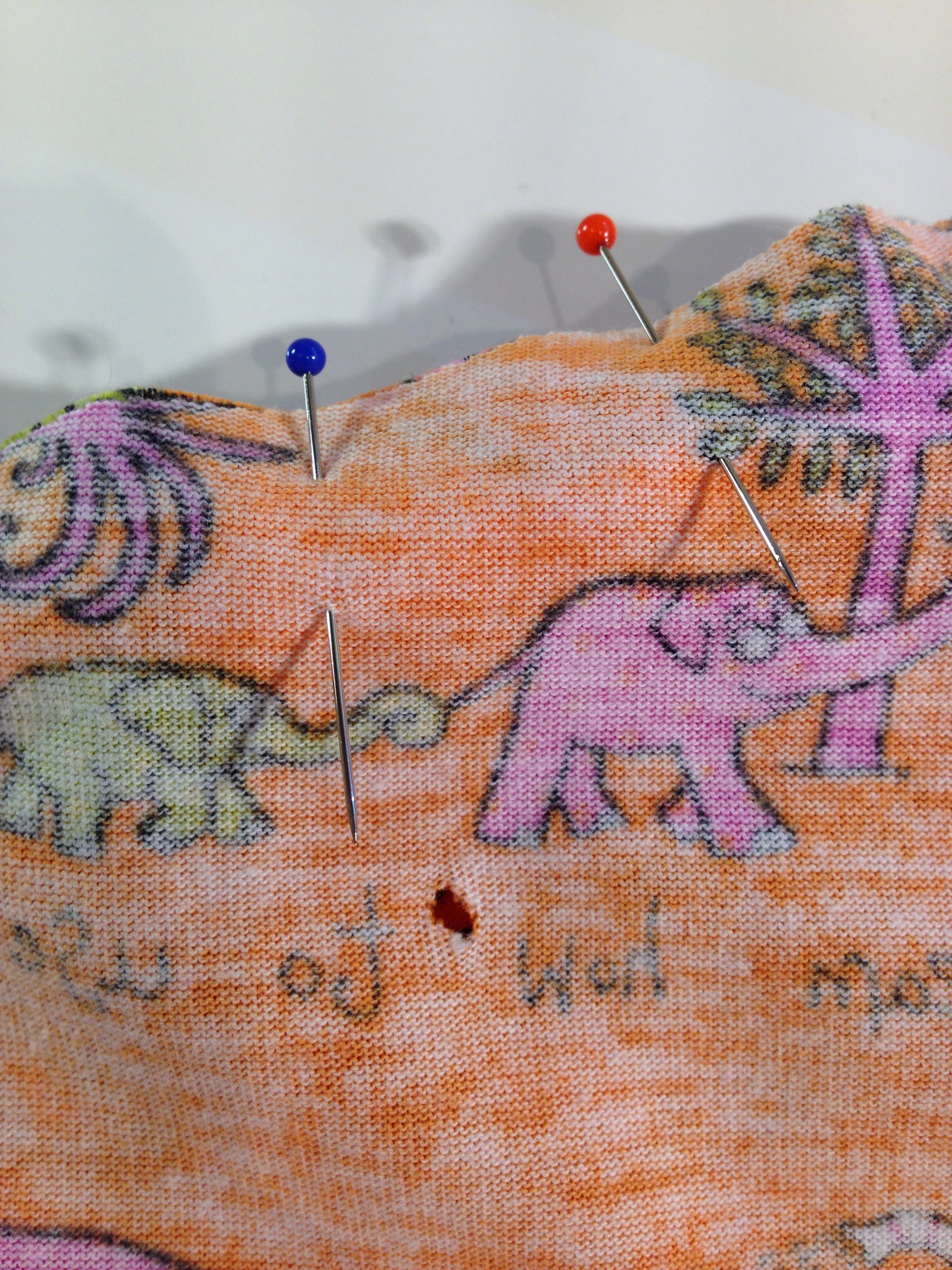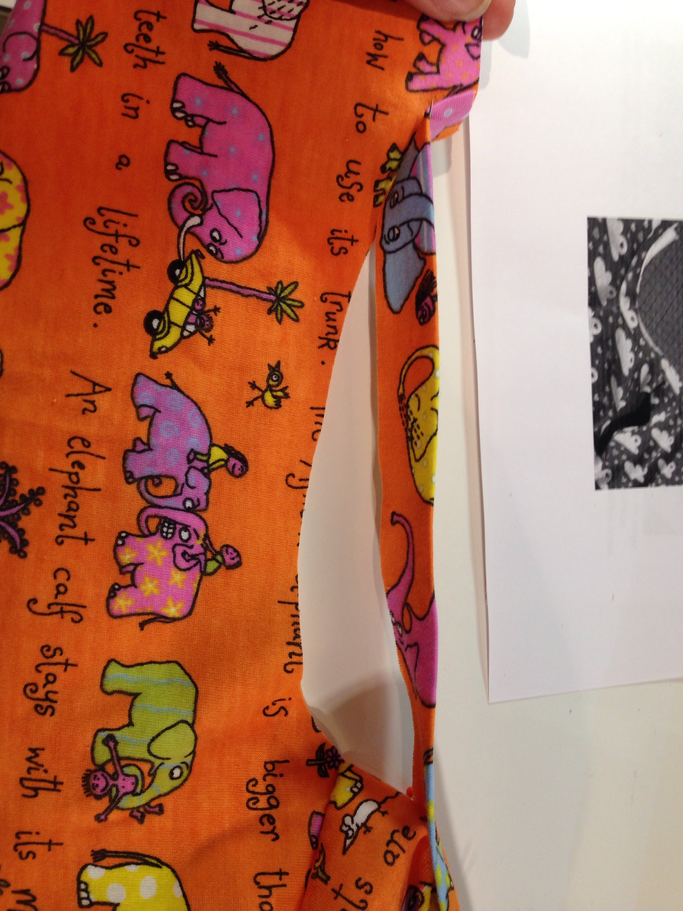 Yes, that is a hole, right behind pink elephant! And no, it wasn’t courtesy of my cutting out as I used my rotary cutter and took extreme care. Thankfully, I had extra fabric left so managed to squeeze an additional skirt piece out of the leftovers, plus I noticed it before I’d sewn that skirt piece on the bodice, rather than after – silver linings and all that.
