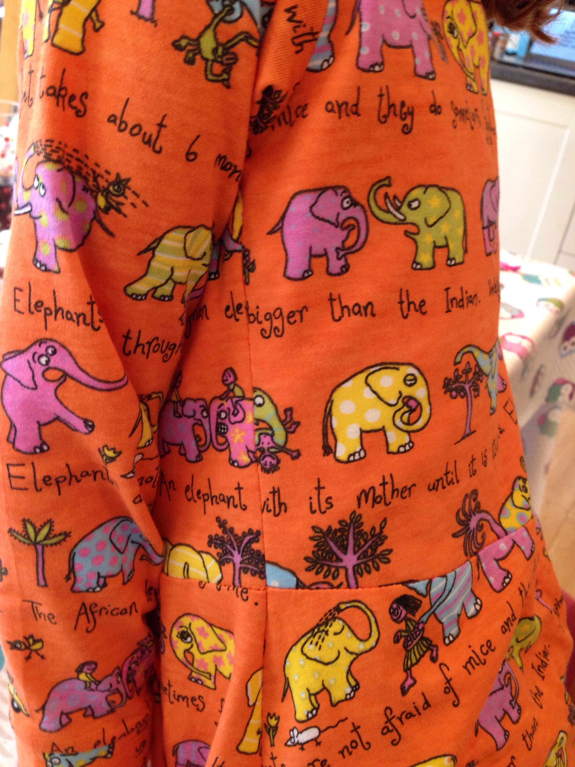 I actually really like this one! I took ages cutting out, partly as this was by far the thinnest stretch fabric I’ve ever used (everything else in my 3 garment repertoire has been a ponte of some sort), partly because I wanted to line up the rows of text that appear between each row of elephants.