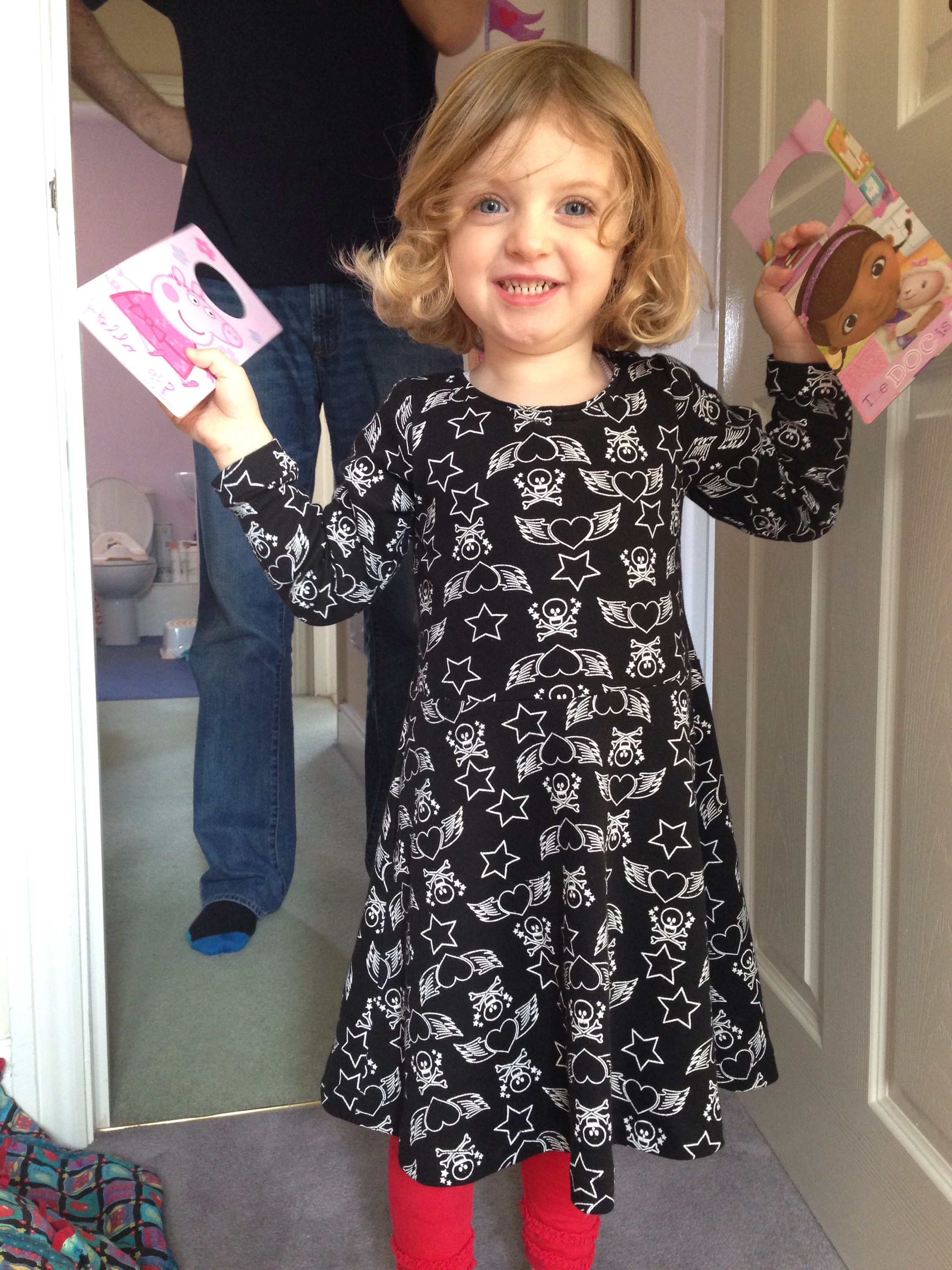 The pirate dress (her description since seeing and insisting on the fabric) is slightly different to the elephant dress. Firstly, the fabric is a heavier jersey. It’s still not heavy as such, it’s just probably more what you’d expect from a winter weight dress. The white printing is a lot more sturdy too, actually probably a disadvantage on such a stretchy dress as it may kind of crumble? but I doubt it’s going to matter.