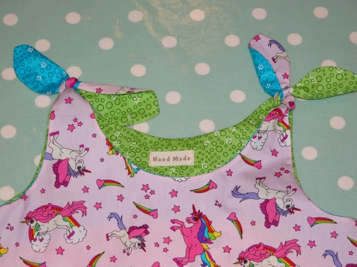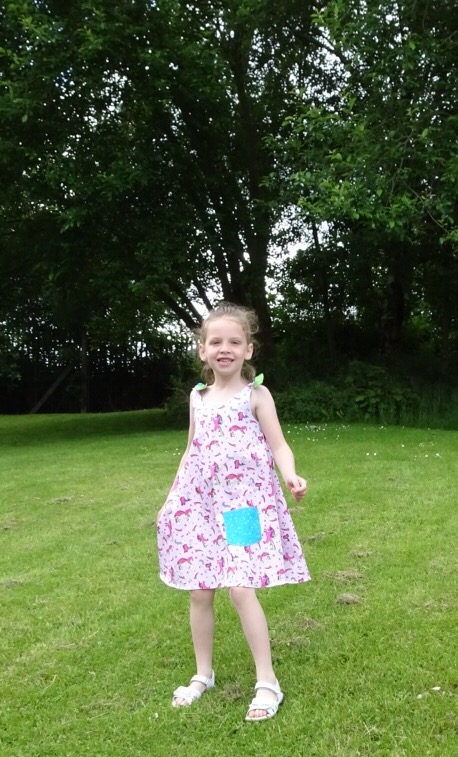 Making the dress up was an absolute doddle. Even finishing all the seams on the overlocker, I got this done in just over an hour. The instructions are clear and it really is incredibly straight forward. So I decided to steam on and cut and sew a dress for the big girl in the same evening; power sewing! Knowing which pattern Lucy was sending, I’d been to Leeds market and picked up this unicorn print poly cotton for Beth; slightly cheaper than the bunnies, you can definitely feel the quality difference (never tell her I said that, they are obviously both completely identical!!)