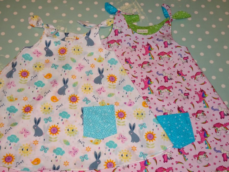 So, one evening’s sewing, two summer holiday dresses; result! The only thing I left til morning was hemming as I thought I’d let the girls decide how long they wanted their dresses.