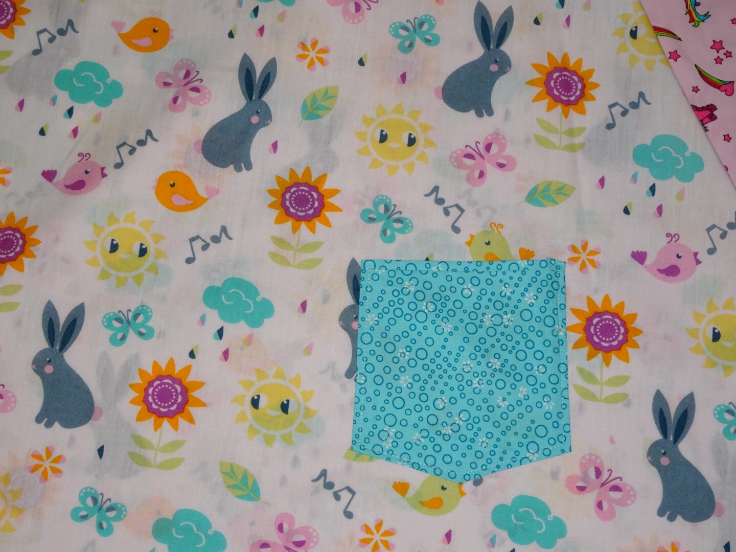 However, I did have some fat quarters in rainbow colours and there are rainbows in with the unicorns, so I simply cut one facing in one coordinating colour, one in another and then cut a pocket from view C to match and tie it all together. I quite liked the pocket, so I added one on to Katie’s dress too.