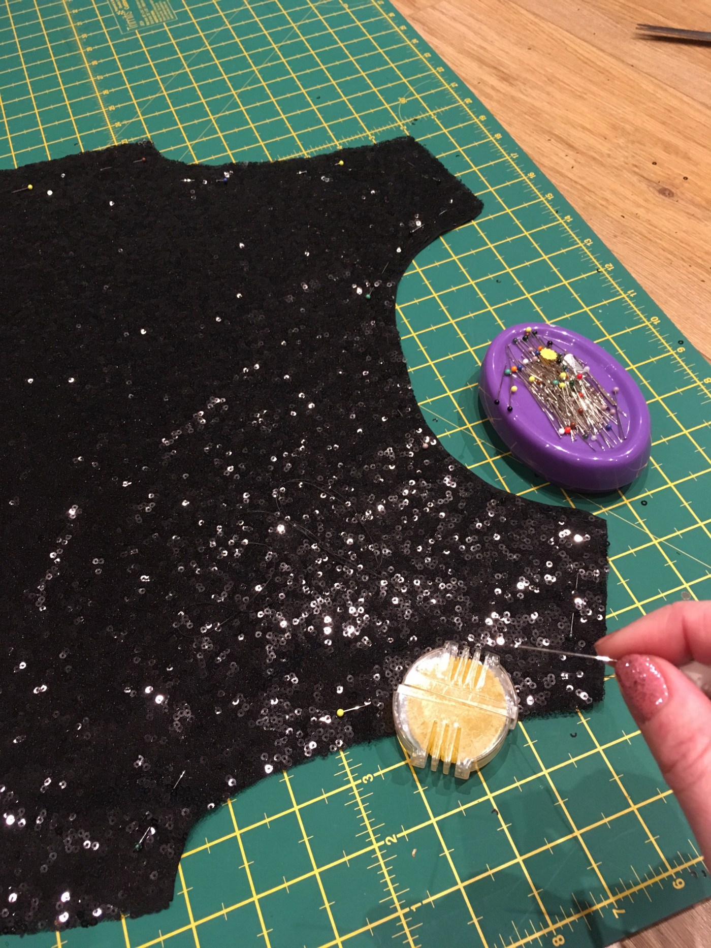 I did worry about the needle choice, but went with the ballpoint needle (80) that I would normally use for the scuba and I got away with it, probably because the sequins are really small.