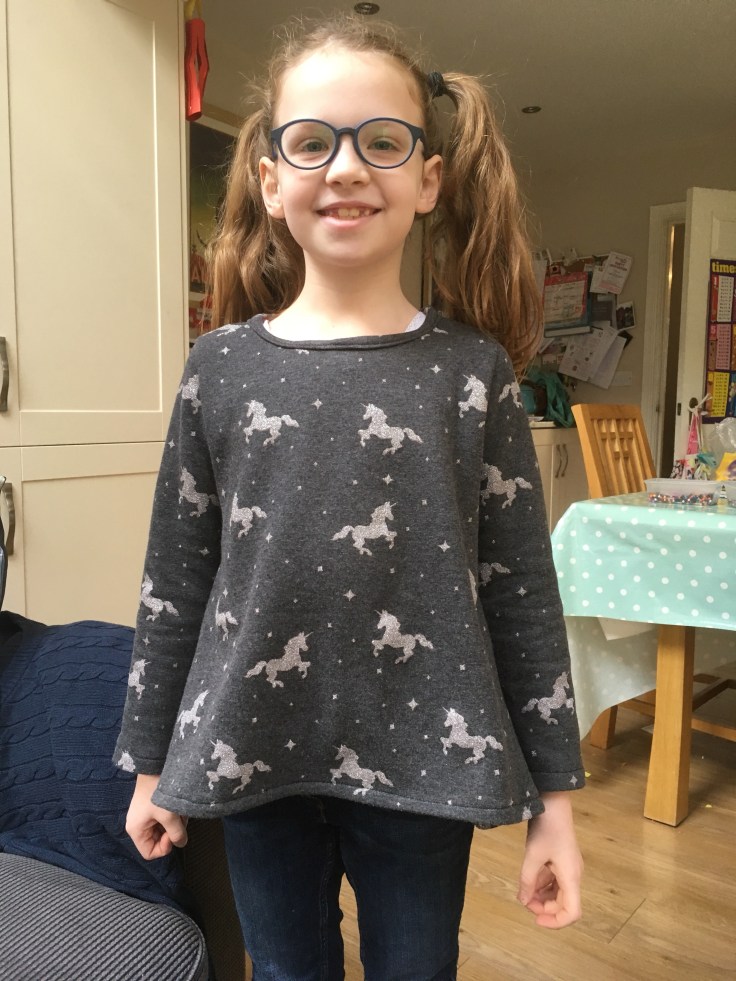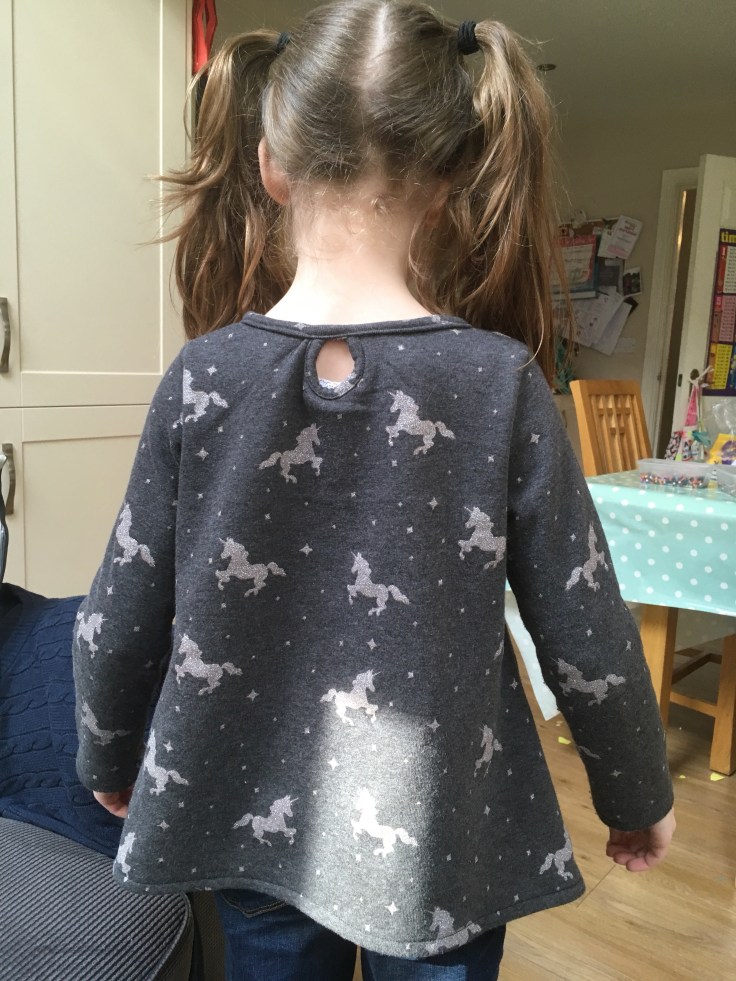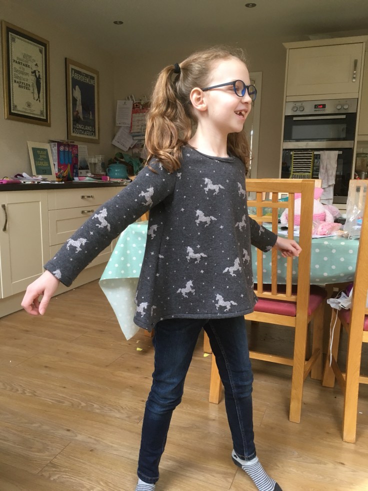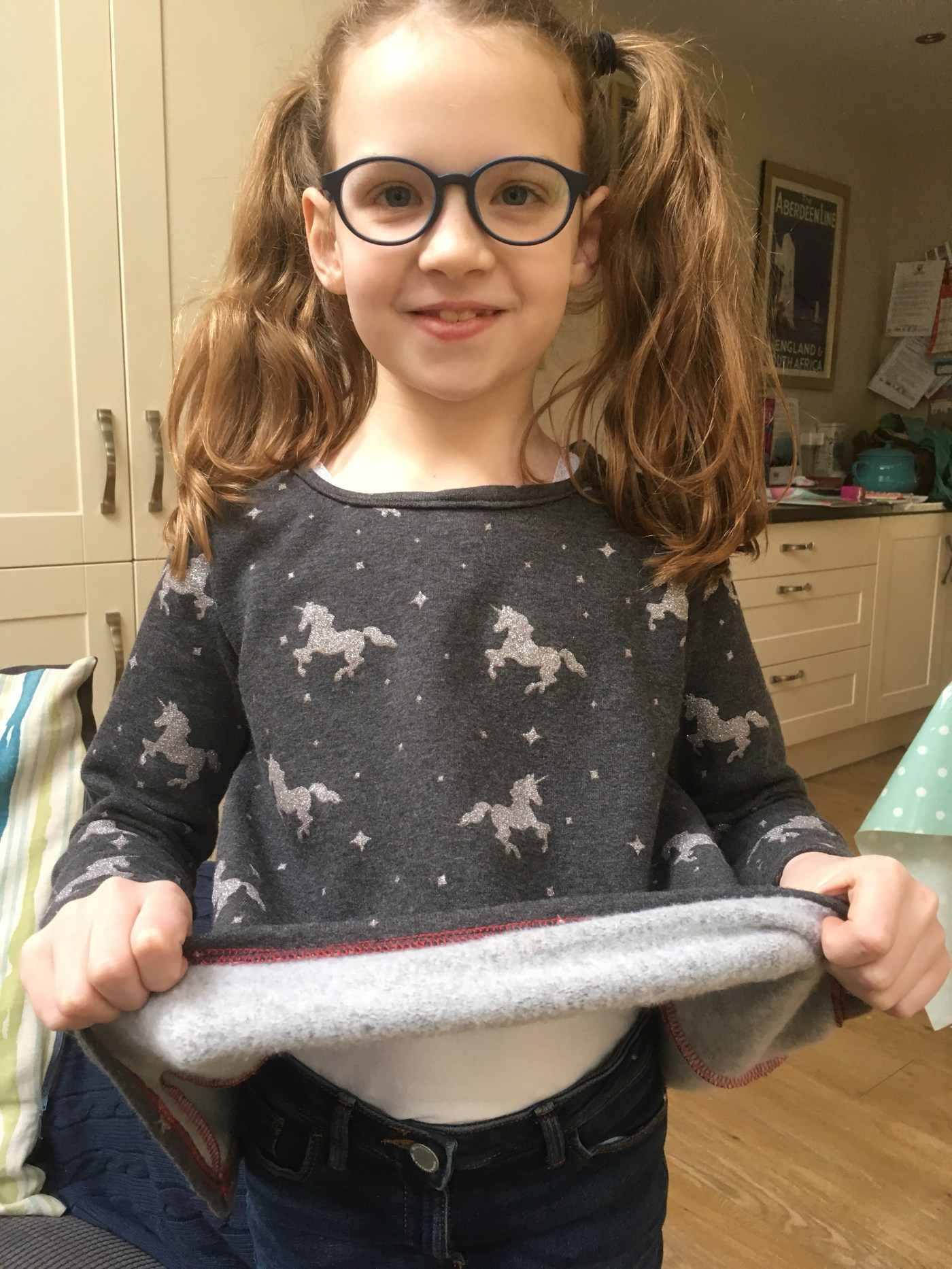 I picked up this fabulous fleece backed glitter unicorn sweatshirting from Fabrics Galore at the Great British Sewing Bee Live last year (did you hear it’s now not happening this year? Gutted!) The prospect of a weekend in the Lake District this half term (read wet and freezing cold) finally prompted me to bump it to the top of the sewing pile for the biggest little girl this week. (Don’t worry, there’s plenty left for the smallest girl too )