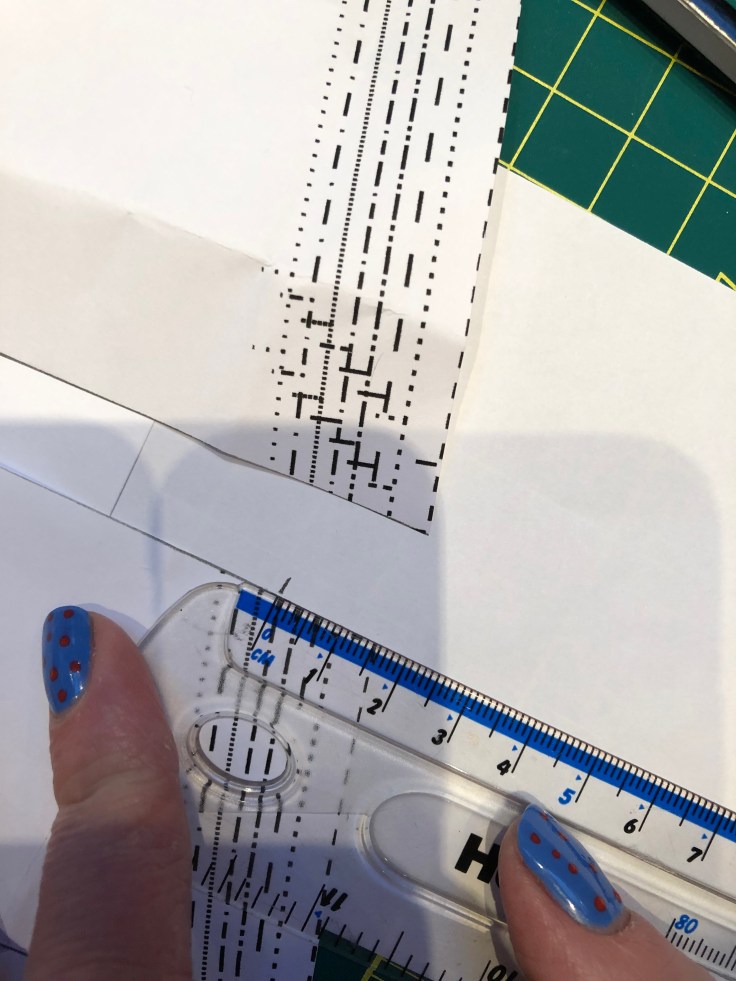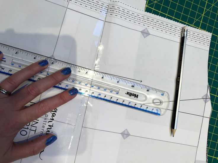 Measure up from the mark, parallel to the grain line, the amount you want to add. I find 1.5cm works well for me. Mark that distance on the extra paper you popped underneath.