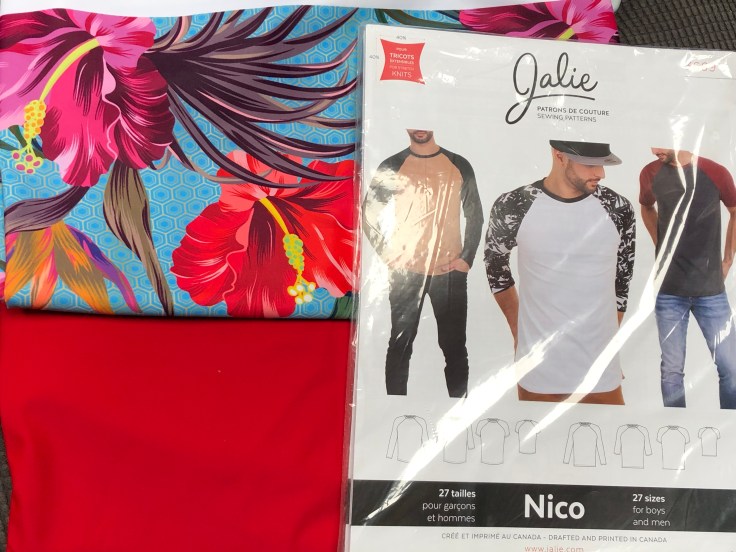 I got very lucky at the Stitch Room Sewcial fabric swap table and snagged a hard copy of another Jalie pattern, the Nico top which is a generic raglan shirt. Again it includes multiple sleeve options and sizes from toddler to fairly large man. I say fairly large because Rich was at the top end of the size chart; this regularly happens to him because he’s built to scale and he’s 6’6″ tall.