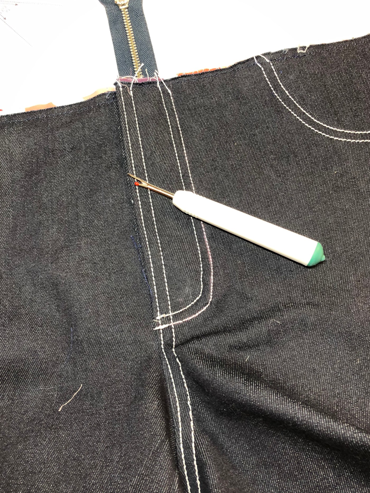 For a gadget lover like me, gadgets are one of the best things about making jeans. SO MANY NEW TOYS! For the record, the ones I’ve found helpful are a hump jumper (to stick behind the pressure foot to make it easier for the machine to deal with the many layers of fabric at the seams), an awl (perfect for making the necessary holes for jeans buttons and rivets), a Chaco chalk marker (really great for making marks on rougher fabrics like denim), a buttonhole chisel (because that denim is pretty tough to get through with a seam ripper!), some form of pliers like the Prym Variopliers to get that button through the denim, and also a magnetic wrist pin cushion.