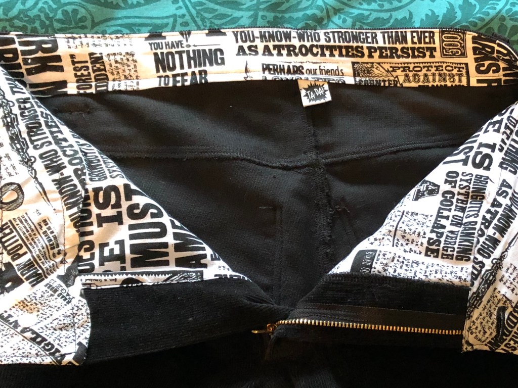 I chose to line my waistband and cut my pocket bags from African wax print, an excellent choice which gives me true joy every time I wear them. The only thing I’ve done differently in the two pairs I’ve made since is to interface the waistband, which I find gives me a much better result.